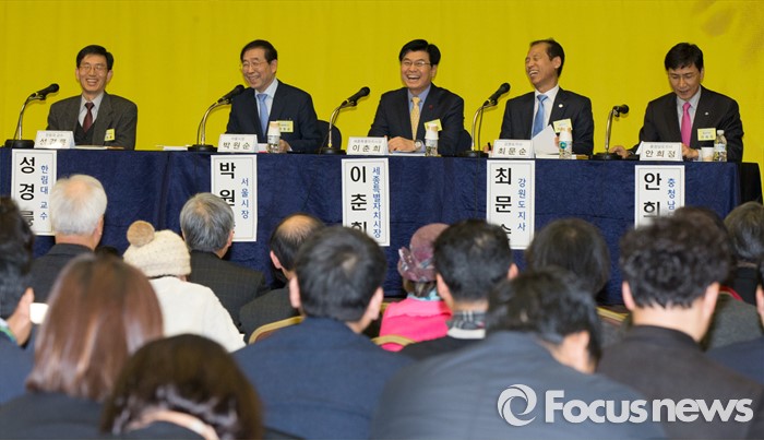 (세종=포커스뉴스) 29일 오후 세종시 정부세종컨벤션센터 국제회의장에서 열린 국가균형발전선언 12주년 기념행사 및 심포지움에 참석한 박원순 서울시장이 인사말을 하고 있다. 왼쪽부터 성경륭 한림대교수, 박원순 서울시장, 이춘희 세종시장, 최문순 강원지사, 안희정 충남지사.