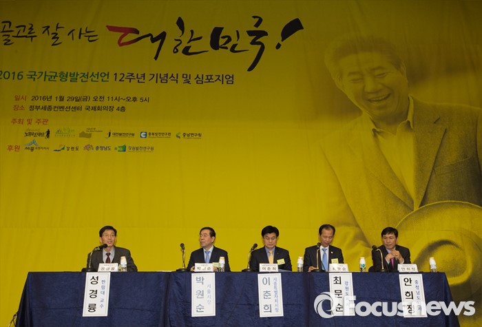 (세종=포커스뉴스) 29일 오전 세종시 정부세종컨벤션센터 국제회의장에서 열린 국가균형발전선언 12주년 기념행사 및 심포지움에서 성경륭 한림대 교수가 토론은 진행하고 있다.왼쪽부터 성경륭 한림대교수, 박원순 서울시장, 이춘희 세종시장, 최문순 강원지사, 안희정 충남지사.