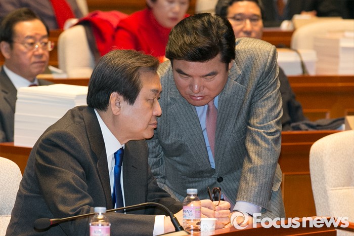 (서울=포커스뉴스) 원유철(오른쪽) 새누리당 원내대표가 29일 오후 서울 여의도 국회에서 여야 원내대표 회동을 마치고 의원총회에 참석해, 김무성 대표에게 보고하고 있다.