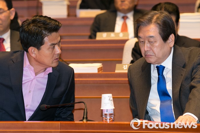 (서울=포커스뉴스) 김무성(오른쪽) 새누리당 대표와 김태호 최고위원이 29일 오후 서울 여의도 국회에서 열린 의원총회에 참석해 대화하고 있다.