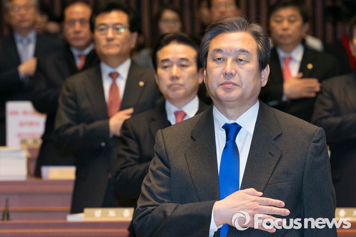 (서울=포커스뉴스) 김무성 새누리당 대표가 29일 오후 서울 여의도 국회에서 열린 의원총회에 참석해 국민의례를 하고 있다.