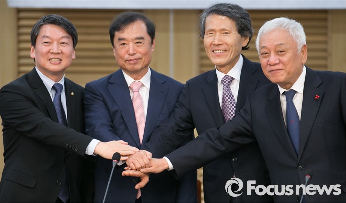 (서울=포커스뉴스) 29일 오후 서울 여의도 국회 의원회관에서 열린 '참여정부 시절 청와대 정책실장을 지낸 김병준 국민대 교수 초청 간담회, 한국정치 제3의 길을 말한다'에 참석한 안철수(오른쪽부터) 국민의당 인재영입위원장, 김 교수, 한상진 공동창당준비위원장, 김한길 상임부위원장이 취재진을 향해 포즈를 취하고 있다.