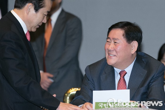 (서울=포커스뉴스) 최경환(오른쪽) 전 경제부총리가 29일 오후 서울 여의도 국회에서 열린 새누리당 의원총회에 참석해, 나성린 의원과 대화하고 있다.