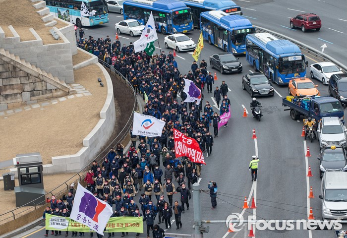 (서울=포커스뉴스) 29일 오후 서울역 광장에서 열린 '한국노총 전국 단위노조 대표자 총력투쟁 결의대회'에 참석한 조합원들이 서울광장을 향해 행진하고 있다.