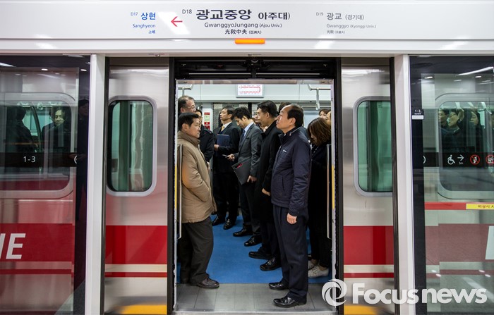 (수원=포커스뉴스) 29일 오후 경기도 수원시 영통구 신분당선 광교중앙역에서 열린 '정자-광교 복선전철 개통행사'를 마친 국토교통부 관계자 및 시공사, 경기철도 관계자들이 시승 하고 있다.