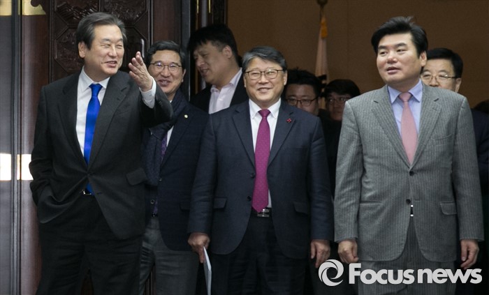 (서울=포커스뉴스) 김무성(왼쪽) 새누리당 대표가 29일 오후 서울 여의도 국회에서 의원총회를 마친 뒤 원유철(오른쪽) 원내대표에거 먼저 나가라고 손짓하고 있다. 가운데는 조원진 원내수석부대표.