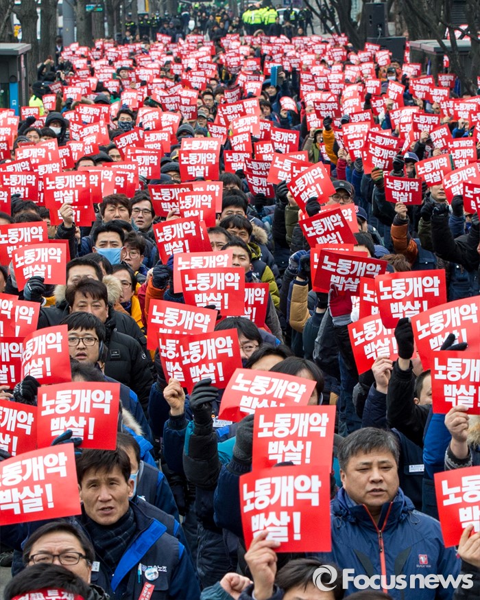 (서울=포커스뉴스) 29일 오후 서울 종로구 정부서울청사 앞에서 열린 금속노조 총파업대회에 참가한 조합원들이 노동개악을 규탄하는 손팻말을 들고 있다.