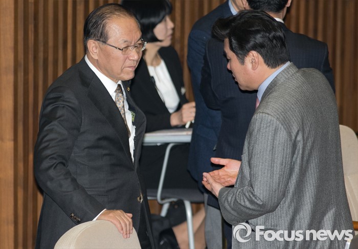 (서울=포커스뉴스) 29일 오후 서울 여의도 국회에서 예정된 338회 국회(임시회) 4차 본회의에 참석한 원유철(오른쪽) 새누리당 원내대표와 황우여 의원이 대화하고 있다.