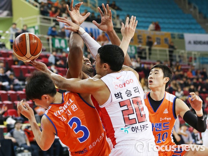 (인천=포커스뉴스) 29일 인천 삼산체육관에서 열린 2015-2016 프로농구 전자랜드-SK 경기에서 SK 사이먼, 박승리와 전자랜드 김지완이 치열한 리바운드 다툼을 벌이고 있다.