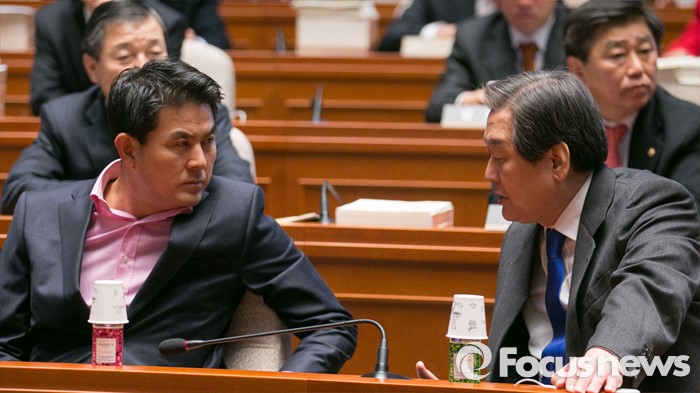 (서울=포커스뉴스) 김무성(오른쪽) 새누리당 대표와 김태호 최고위원이 29일 오후 서울 여의도 국회에서 열린 의원총회에 참석해 생각에 잠겨 있다.