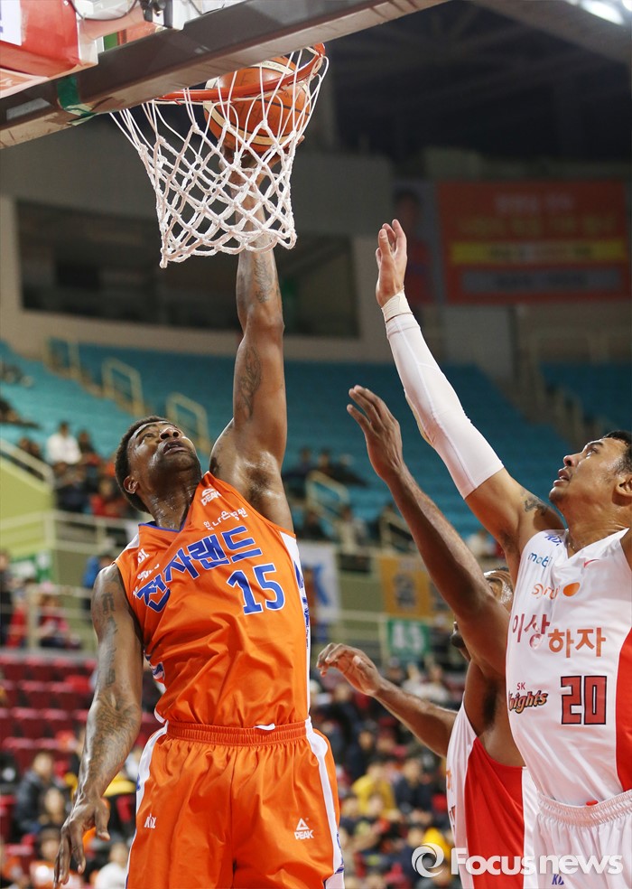 (인천=포커스뉴스) 29일 인천 삼산체육관에서 열린 2015-2016 프로농구 전자랜드-SK 경기에서 전자랜드 포웰이 골밑슛을 시도하고 있다.