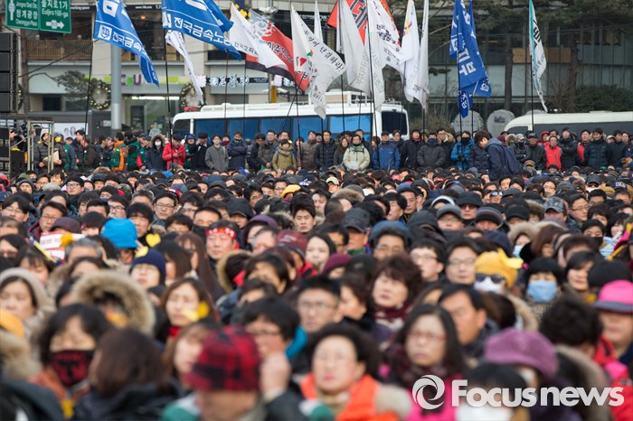 (서울=포커스뉴스) 30일 오후 서울광장에서 열린 '민주노총 전국노동자대회'에서 민주노총 조합원들이 정부의 '일반 해고'와 '취업규칙 변경' 양대 지침 철회와 노동개악 중단을 촉구하는 집회를 열고 있다.