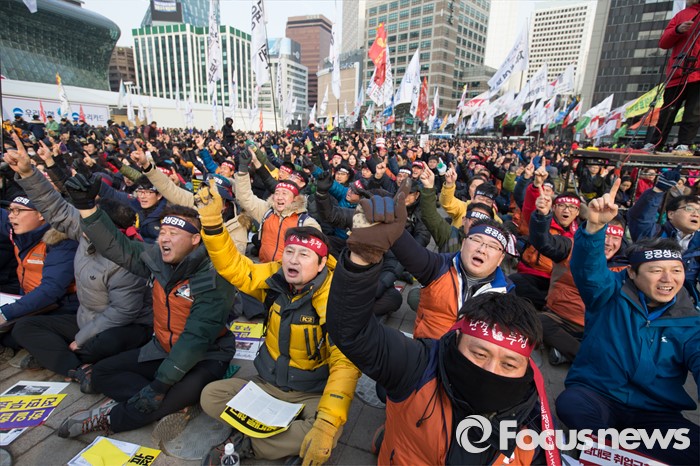 (서울=포커스뉴스) '민주노총 전국노동자대회'가 열린 30일 오후 서울광장에서 민주노총 조합원들이 정부의 '일반 해고'와 '취업규칙 변경' 양대 지침 철회와 노동개악 중단을 촉구하고 있다.
