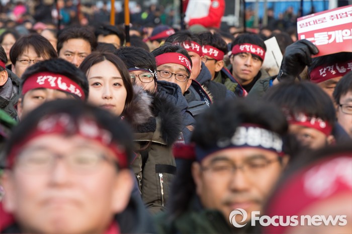 (서울=포커스뉴스) '민주노총 전국노동자대회'가 열린 30일 오후 서울광장에서 민주노총 조합원들이 정부의 '일반 해고'와 '취업규칙 변경' 양대 지침 철회와 노동개악 중단을 촉구하고 있다.