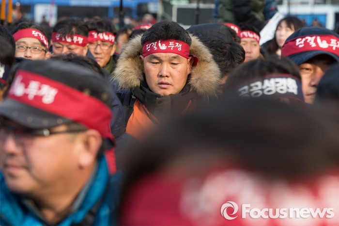 (서울=포커스뉴스) '민주노총 전국노동자대회'가 열린 30일 오후 서울광장에서 민주노총 조합원들이 정부의 '일반 해고'와 '취업규칙 변경' 양대 지침 철회와 노동개악 중단을 촉구하고 있다.