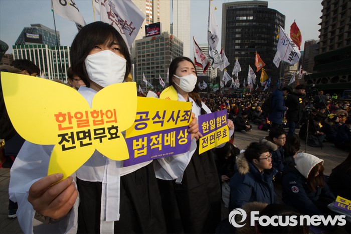 (서울=포커스뉴스) 한일 일본군 위안부 합의 무효와 정의로운 해결을 위한 전국행동 회원들이 30일 오후 서울광장에서 열린 '한일합의 무효선언 전국행동의 날' 행사에서 피켓을 들고 있다.