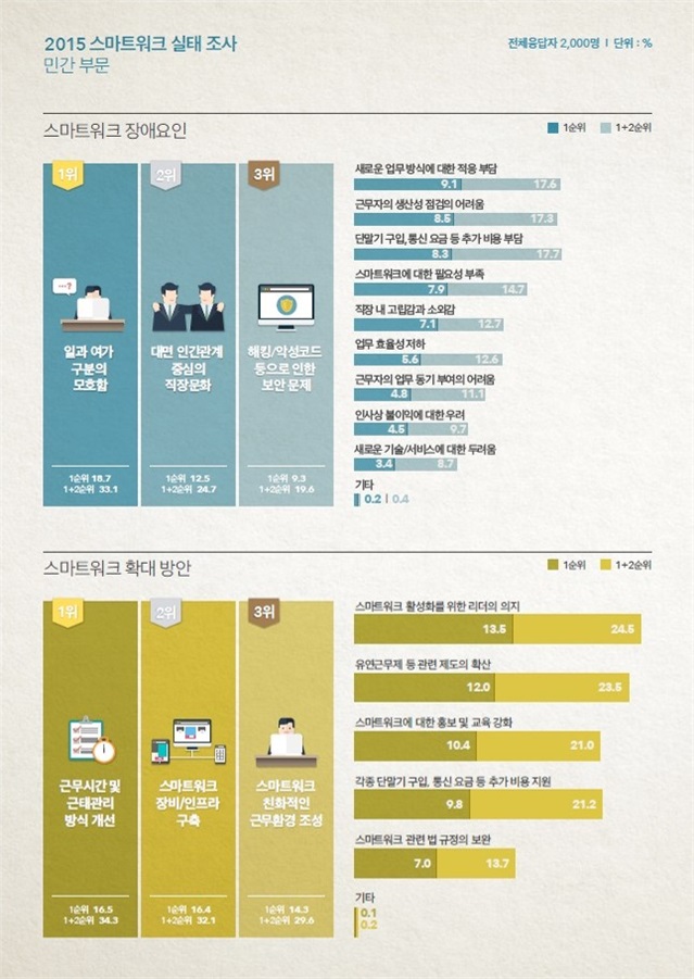 조사결과에 따르면, 민간부문에서 2015년 스마트워크 이용률은 14.2%로 2012년 대비 3.8%포인트 증가했고 사업장의 규모가 클수록 이용률이 높은 것(100인 이상 사업장 21.4% 이용)으로 조사됐다.(2012년 10.4%→2013년 12.9%→2014년 13.4%→2015년 14.2%)