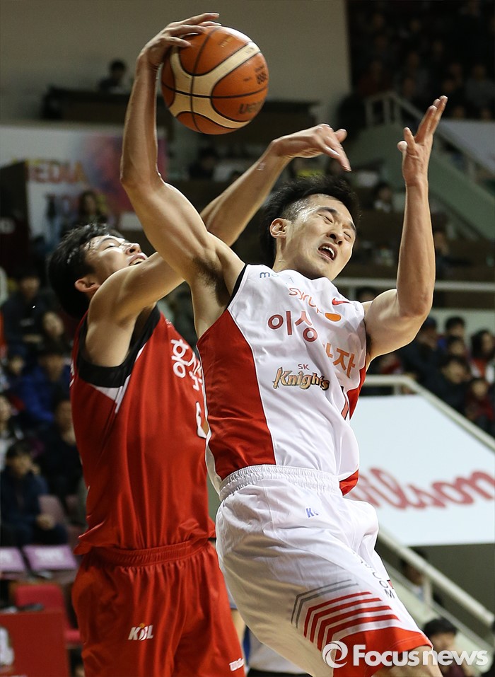 (안양=포커스뉴스) 31일 안양실내체육관에서 열린 2015-2016 프로농구 KGC-SK 경기에서 SK 변기훈이 KGC 강병현에 앞서 리바운드볼을 잡고 있다.