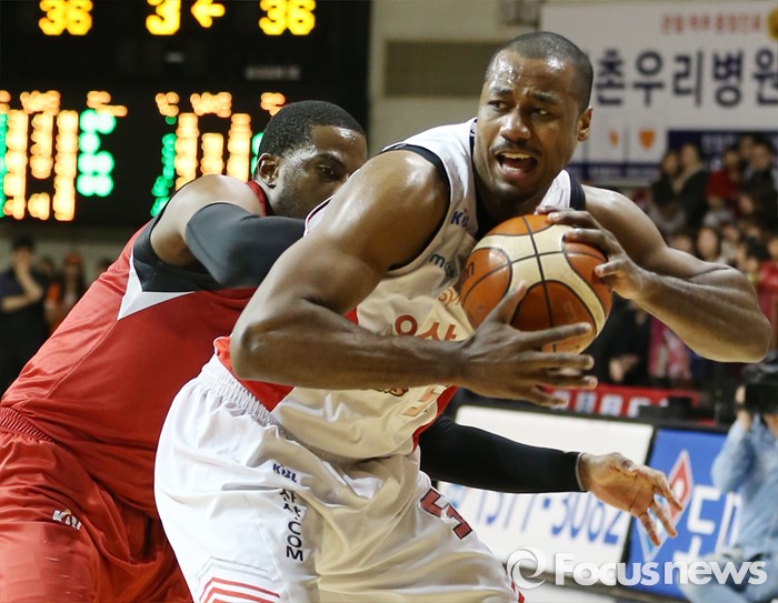 (안양=포커스뉴스) 31일 안양실내체육관에서 열린 2015-2016 프로농구 KGC-SK 경기에서 SK 사이먼을 KGC 찰스 로드가 뒤에서 밀착 수비를 하고 있다.