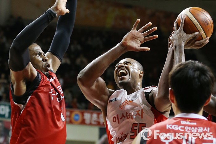 (안양=포커스뉴스) 31일 안양실내체육관에서 열린 2015-2016 프로농구 KGC-SK 경기에서 SK 사이먼이 슈팅을 시도하다 KGC 마리오 리틀에게 파울을 당하고 있다.