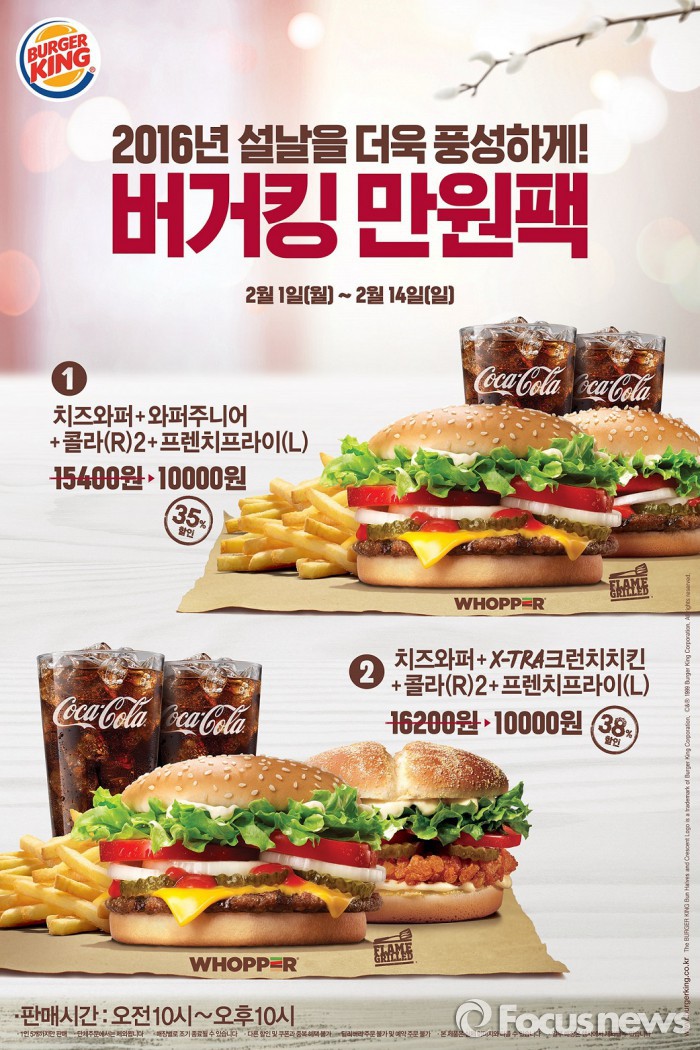 (서울=포커스뉴스) 햄버거 브랜드 버거킹은 오는 14일까지 오전 10시부터 오후 10시 전국 버거킹 매장에서 ‘설날 1만원팩’ 2종을 판매한다.