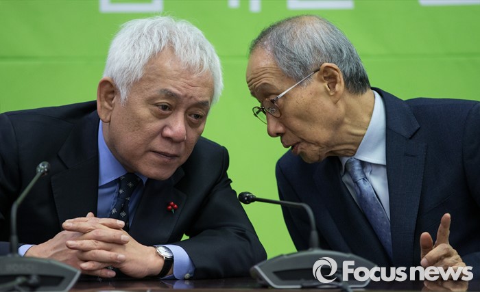 (서울=포커스뉴스) 국민의당 김한길 의원과 윤여준 공동창준위원장이 1일 오전 서울 마포구 국민의당 당사에서 열린 기획조정회의에서 귀엣말을 하고 있다.
