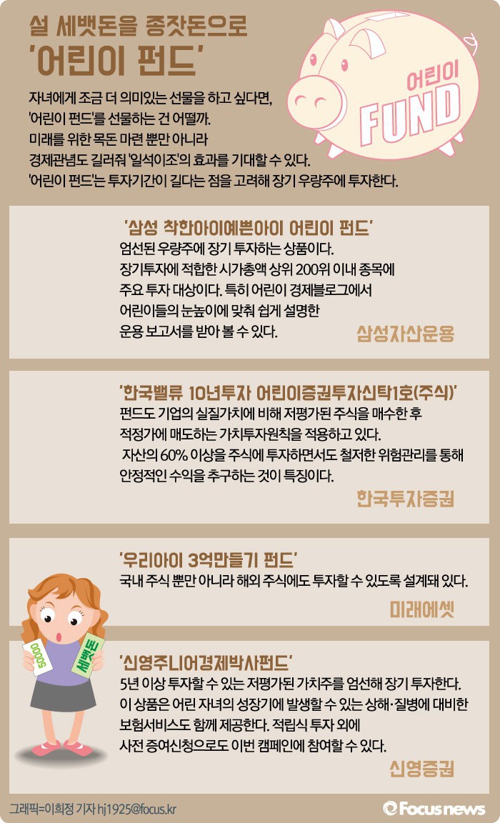 (서울=포커스뉴스) 설날 자녀에게 조금 더 의미있는 선물을 하고 싶다면, '어린이 펀드'를 선물하는 건 어떨까. 미래를 위한 목돈 마련 뿐만 아니라 경제 관념도 길러줘 '일석이조'의 효과를 기대할 수 있다. '어린이 펀드'는 일반 펀드와 운용 측면에선 큰 차이가 없다. 투자기간이 길다는 점을 고려해 장기 우량주에 투자한다.