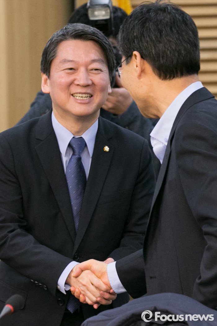 (서울=포커스뉴스) 안철수(왼쪽) 국민의당 인재영입위원장과 장하성 고려대 교수가 1일 오전 서울 여의도 국회 의원회관에서 열린 경제토크에 참석해 악수하고 있다.