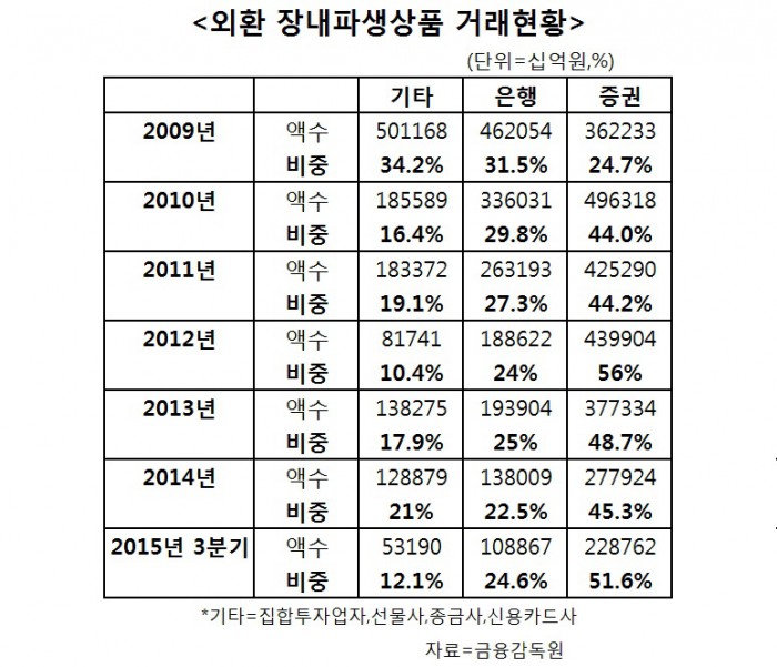 선물사가 포함된 기타의 2009년 외환장내파생상품의 거래금액은 501조1680억원, 비중은 34.2%에 달했다. 하지만 2012년 거래 비중이 10.4%까지 하락했다. 올해 3분기에도 거래금액은 53조1900억원, 12.1%에 지나지 않았다.