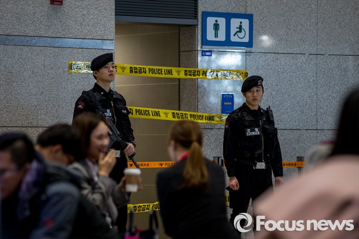 (인천공항=포커스뉴스) 인천국제공항에 폭발물 의심 물체와 함께 아랍어로 된 협박성 메모가 발견된 사건 수사가 진행되고 있는 1일 오후 폭발물 의심 물체가 발견된 인천공항 입국장 화장실에서 경찰병력이 경계 근무를 서고 있다.