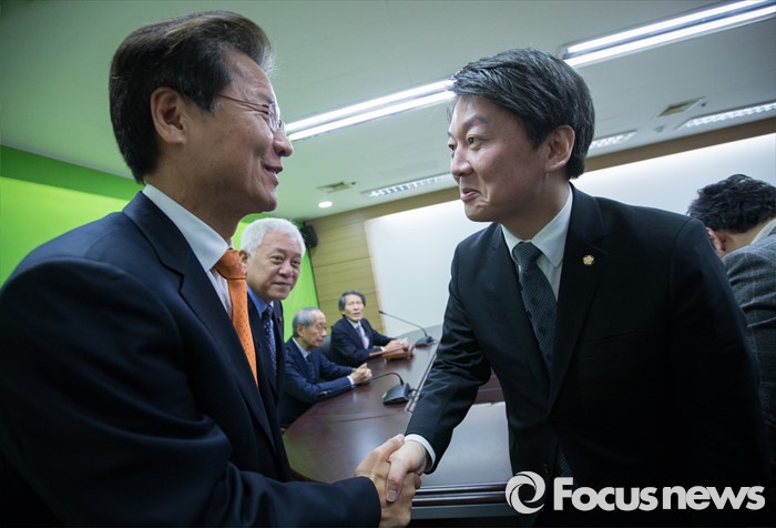 국민의당은 오는 2일 대전 중구 한밭체육관에서 창당대회를 열고 제3당으로서 행보를 시작한다.국민의당 안철수 의원이이 27일 오전 서울 마포구 국민의당 당사에서 열린 기획조정회의를 마치고 천정배 의원과 인사를 나누고 있다. 2016.01.27 김흥구 기자