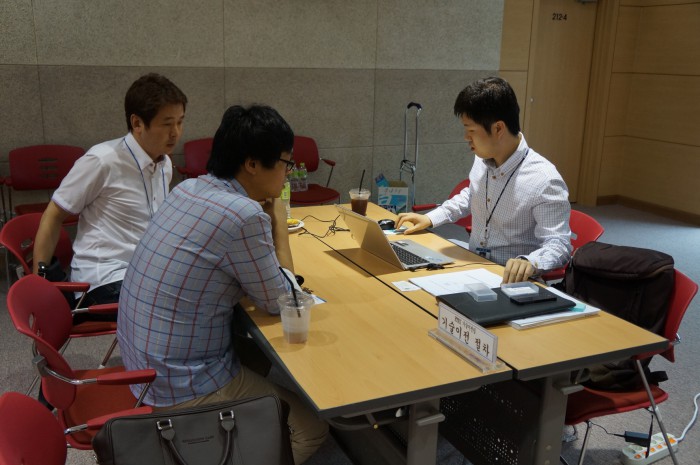 김서균 ETRI 중소기업협력부장은 "기술 기반의 ETRI 출신 창업 기업에겐 오랜 기간 기업에서 쌓은 실무 경험과 노하우를 지닌 경영자들의 멘토링이 경영에 큰 도움이 된다"면서 "이 행사를 통해 보다 많은 창업기업이 글로벌 경쟁력을 갖춘 기업으로 성장하도록 전경련 창조경제지원단과 지원하겠다"고 말했다.지난 2014년 ETRI 융합기술연구생산센터에서 ETRI 연구원 출신 예비창업자를 대상으로 창업 및 기술이전 상담 행사를 진행했다. <사진제공=ETRI>