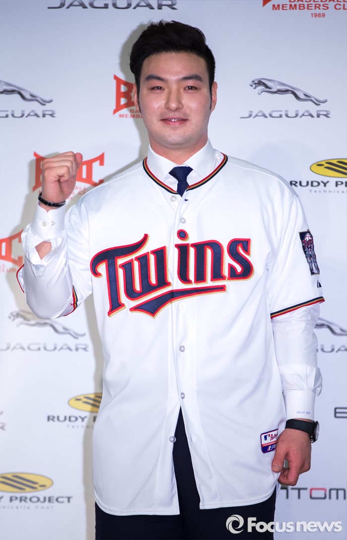 ※2015시즌 성적은 타율-홈런-타점-OPS 순. 박병호는 한국프로야구 성적(서울=포커스뉴스) 미네소타 트윈스에 입단한 박병호가 7일 오전 서울 서대문구 그랜드힐튼호텔에서 기자회견을 열고 메이저리그 진출에 대한 소감과 포부를 밝힌 뒤 미네소타 트윈즈 유니폼을 입고 포즈를 취하고 있다. 2016.01.07 성동훈 기자