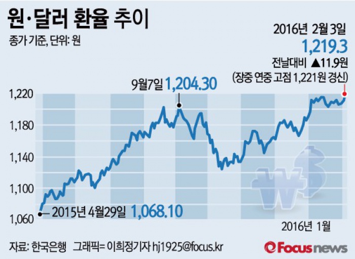 3일 서울 외환시장에서 원·달러 환율은 전 거래일보다 11.9원 상승(0.99%·원화 가치 하락)한 1219.3원으로 거래를 마쳤다. 이날 달러화 대비 원화 가치는 장중 한 때 1221.1원까지 오르면서 1220원선을 돌파했다. 원화 가치가 1220원을 돌파한 것은 2010년 7월 7일(1226.6) 장중 고가를 돌파한 이후로 5년 7개월 여만이다.