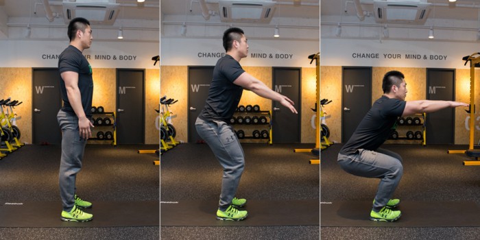 2 엉덩이를 뒤로 빼면서 무릎이 발끝보다 나오지 않도록 유의한다.