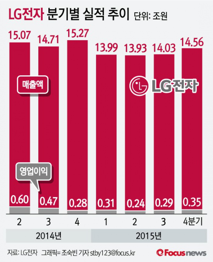 업계 관계자는 "많이 팔고도 이익을 못 내는 LG전자의 실적구조를 벗어나기 위해서는 프리미엄폰인 G5의 성공은 필수적"이라며“프리미엄폰 시장의 경쟁이 치열해지지만, G5가 역대 최고 수준의 사양을 갖춘 만큼 성과가 나올 것으로 본다"고 말했다.(서울=포커스뉴스) LG전자는 26일 지난해 4분기 영업이익은 3490억원으로 3분기 대비 18.7%증가했으며, 매출액은 14조5601억원으로 3분기보다 3.5% 중거한 수치라고 공시했다. 2016.01.26 조숙빈 기자