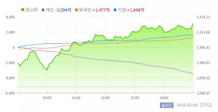 4일 코스피지수는 전일 대비 1.35%(25.59포인트) 오른 1916.26에 장을 마쳤다. 코스닥지수는 전날 보다 0.39%(2.68포인트) 상승한 683.62에 마감했다.