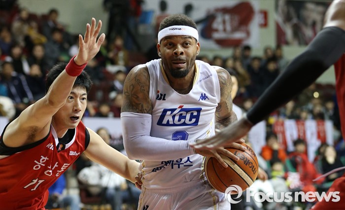 에밋의 개인 첫 라운드 MVP. KCC로서는 지난 2009~2010시즌 하승진(9월 MVP) 이후 6시즌 만에 소속선수 MVP 선정 기쁨을 맞았다.(안양=포커스뉴스) 13일 안양실내체육관에서 열린 2015-2016 프로농구 KGC-KCC 경기에서 KCC 안드레 에밋이 KCC 양희종의 마크를 뿌리치며 골밑으로 대시하고 있다. 2016.01.13 우정식 기자