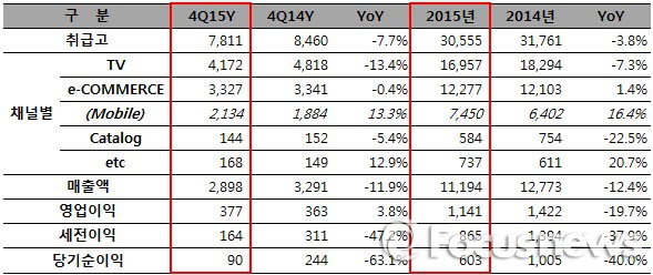 한편 지난해 4분기 영업이익은 송출수수료 감소 및 저마진 상품 판매 축소에 따른 매출이익률 개선으로 전년 4분기 대비 3.8% 증가한 377억원을 달성하며 증가세로 전환했다.