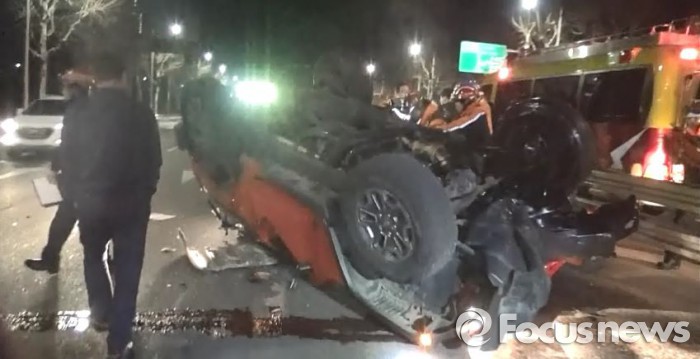 (서울=포커스뉴스) 7일 오전 1시 11분쯤 서울 강남구 대치동 학여울역 인근 도로에서 잠실 방향으로 달리던 지프차량이 중앙분리대를 들이받고 전복하는 사고가 발생했다.