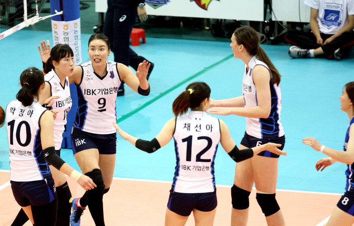 IBK기업은행 맥마혼의 투혼이 빛난 경기였다. 맥마혼은 무려 45득점을 올리며 김희진의 공백을 느끼지 못하게 했다. 박정아도 17득점으로 팀승리에 보탬이 됐다. 반면 현대건설은 에밀리와 황연주가 각각 23점과 20점으로 공격을 이끌었지만 팀 패배를 막지 못했다.환호하는 IBK기업은행 선수들. <사진제공=한국배구연맹>