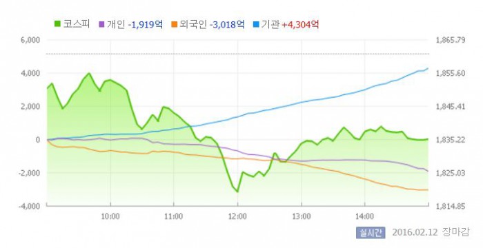 이날 일본 닛케이225지수는 전거래일 대비 4.8% 급락한 1만4952.61로 마감했다. 중국, 대만 증시는 춘절 연휴로 12일까지 휴장했다.12일 유가증권시장 <그래픽출처=네이버>