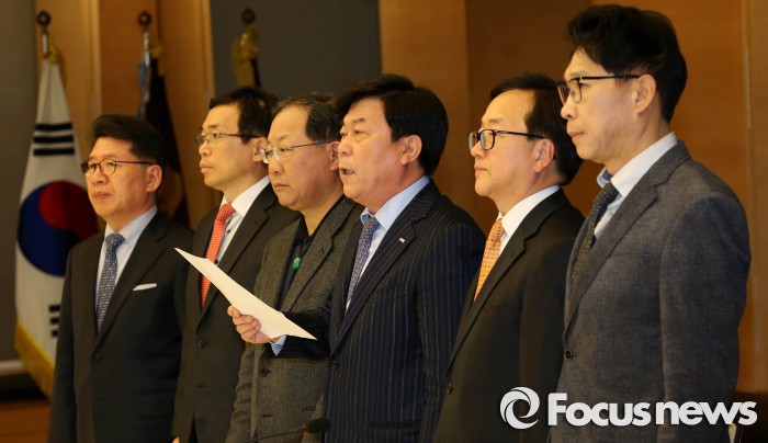 (서울=포커스뉴스) 대한상공회의소 등 경제 6단체는 12일 오후 서울 세종대로 상의회관에서 ‘대내외 리스크 극복과 좋은 일자리 창출을 위한 경제활성화법안 입법촉구 공동성명서’를 발표했다.
