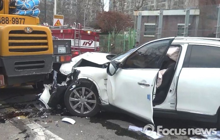 (서울=포커스뉴스) 14일 오후 5시 29분쯤 서울 송파구 잠실동 탄천2교 삼거리 인근에서 인피니티 차량이 주차된 15톤짜리 크레인 후미를 들이받는 사고가 발생했다.