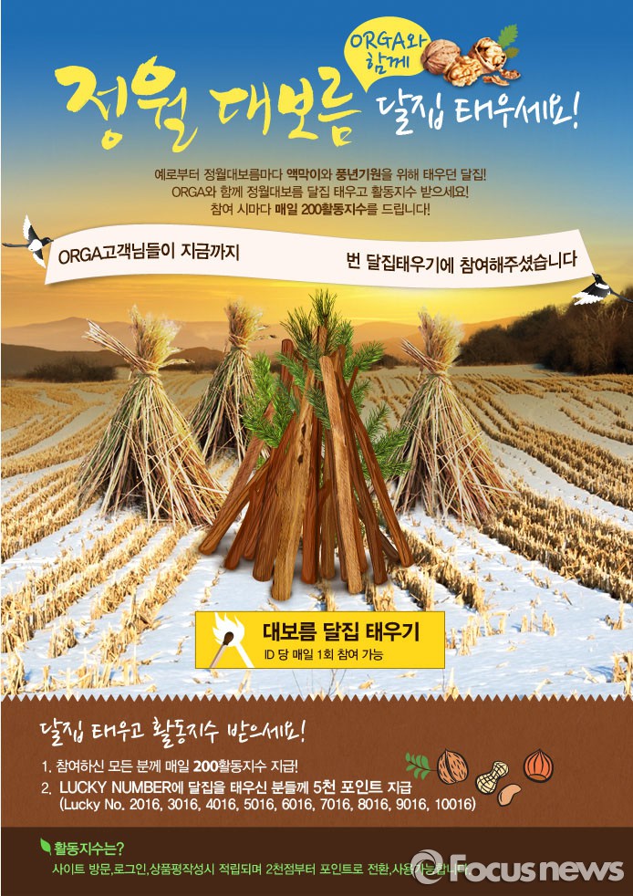 올가 온라인 몰에서는 정월대보름에 액을 막고 풍년을 기원하며 볏으로 된 달집을 태우던 풍습을 재현한 ‘행복기원 이벤트’를 연다. 참여 고객에게는 매일 200포인트를 지급하며, LUCKY NUMBER(2016, 3016, 4016, 5016, 6016, 7016, 8016, 9016, 10016)에 달집을 태운 고객에게는 26일에 5000 포인트를 제공한다.정월대보름 맞이 '행복기원 이벤트' 포스터. <사진제공=올가홀푸드>