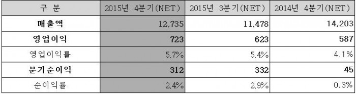 매출액은 1조2735억원으로 2014년 4분기(1억4203억원)보다 1468억원 줄었다.