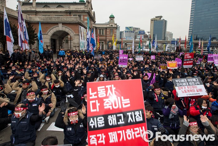 노사정위원회법에 따르면 적법한 노사정위 회의는 재적위원 과반 출석과 출석위원 3분의 2이상의 찬성으로 개의를 의결할 수 있다. 다만 노‧사‧정 각 대표 대표위원 2분의 1이상이 출석해야 한다.(서울=포커스뉴스) 29일 오후 서울역 광장에서 열린 '한국노총 전국 단위노조 대표자 총력투쟁 결의대회'에 참석한 조합원들이 정부가 발표한 양대 행정지침 폐기를 촉구하는 구호를 외치고 있다. 2016.01.29 양지웅 기자