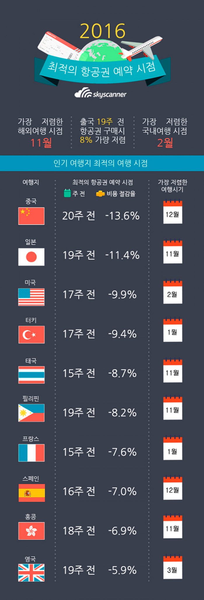 여행 가격비교사이트 스카이스캐너가 16일 발표한 '최적의 항공권 예약 시점(Best Time To Book) 보고서에 따르면 한국에서 출발하는 항공권을 구매할 때에는 동일한 조건의 항공권이라 하더라도 19주 전에 예약해야 가장 저렴하게 구입할 수 있는 것으로 나타났다. 여행지에 따라 편차는 있지만 출국 19주 전 항공편을 구매하면 평균적으로 8% 가량 비용이 저렴했다.