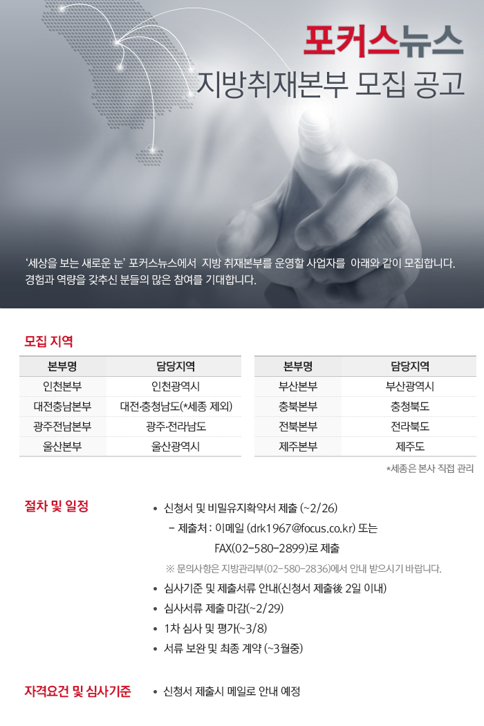 (서울=포커스뉴스) '세상을 보는 새로운 눈' 포커스뉴스에서 지방 취재본부를 운영할 사업자를 아래와 같이 모집합니다. 경험과 역량을 갖추신 분들의 많은 참여를 기대합니다.