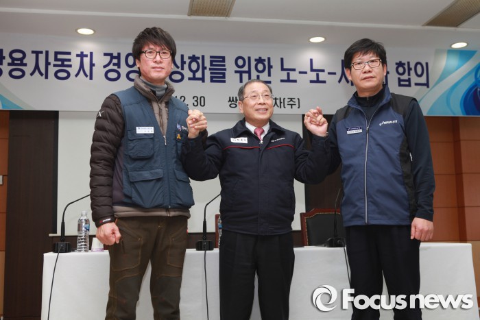 노사간 합의에 이어 법적인 문제까지 해결되면서 7년간 이어진 쌍용차 사태는 완전히 종결됐다.쌍용자동차는 30일 평택공장에서 이사회를 개최하고 지난 11일 잠정합의 된 ‘쌍용자동차 경영정상화를 위한 합의서’를 의결함으로써 노∙노∙사 3자간 합의안이 최종 타결됐다고 밝혔다. 쌍용차 평택공장 본관에서 진행된 조인식에서 최종식 쌍용차 대표이사(가운데), 홍봉석 쌍용차 노조위원장(오른쪽), 김득중 금속노조 쌍용차지부장(왼쪽) 3자 대표가 손을 맞잡고 있다. <사진제공=쌍용자동차>